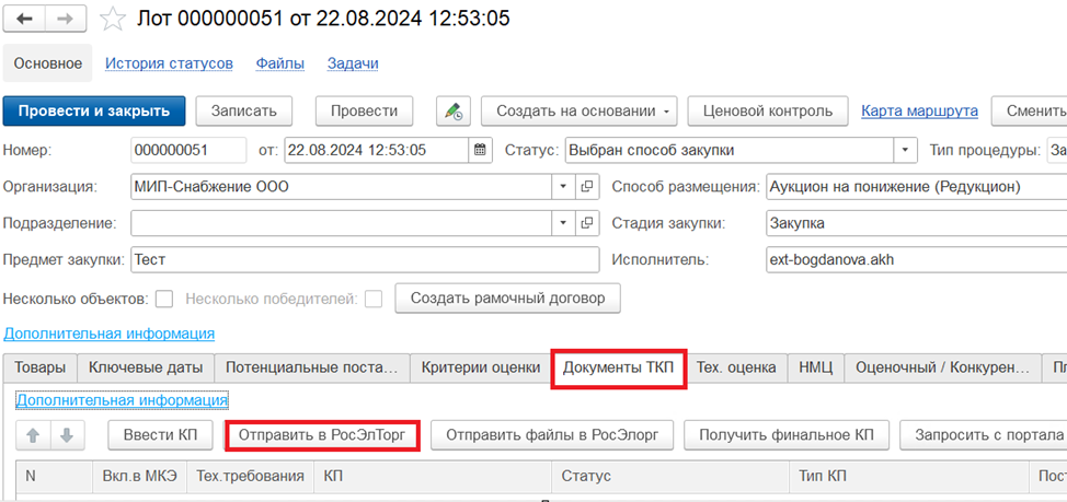 1. Формирование закупочной процедуры в 1С
